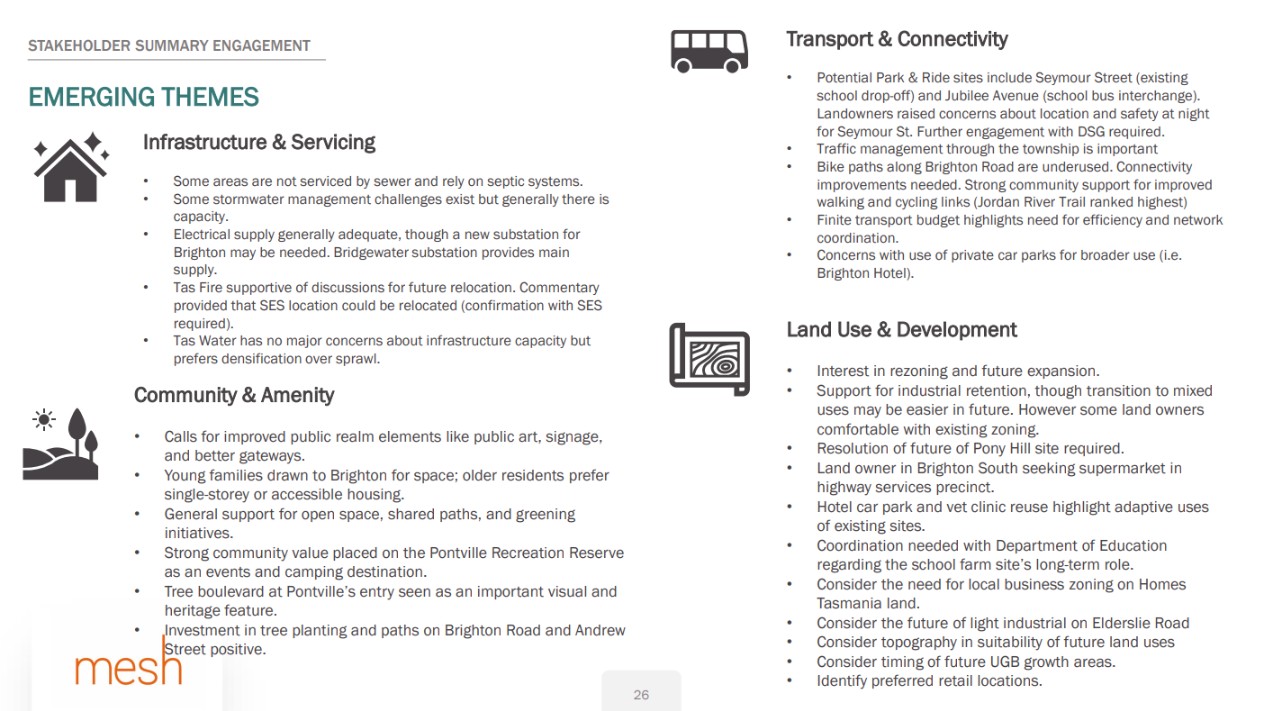 During consultation undertaken so far for the Brighton & Pontville Local Area Plan, the community and key stakeholders shared clear priorities for how the area should grow and change. Here’s a snapshot of the key themes: